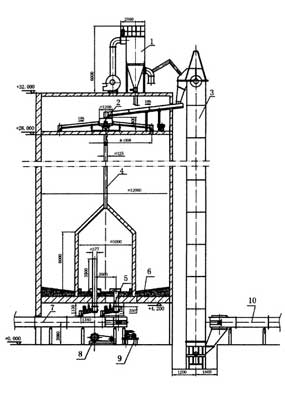 连续式均化库是生料从库顶连续进料,经过充气搅拌的同时连续出料,库在中心位置设一个圆柱形混合室,以降低库内卸料压力,消除漏斗流,在混合室周围6-12卸料孔,在混合室与库壁之间有6-12个充气区,卸料时轮流向中心室进料,进入混合室的物料因混合室连续充气而进一步混合.